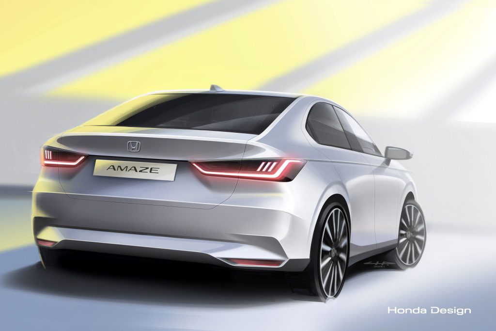 The new sketches reveal a true sedan shape that reflects a higher-class car while remaining in the compact sedan segment. The bold and wide stance of the All New Amaze offers a confident appearance that amplifies the model’s appeal,while the aerodynamic sleek lines extending from the distinctive headlights to the rear combination lamps contribute a strong and sporty look.