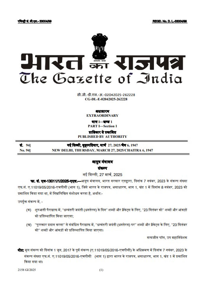 New Delhi : In a landmark decision aimed at enhancing global visibility and consistency in observance, the Government of India has designated 23rd September as the date for celebrating Ayurveda Day each year. This change, notified through a Gazette Notification dated 23rd March 2025, marks a significant shift from the earlier practice of observing Ayurveda Day on Dhanteras, which follows a variable lunar calendar.