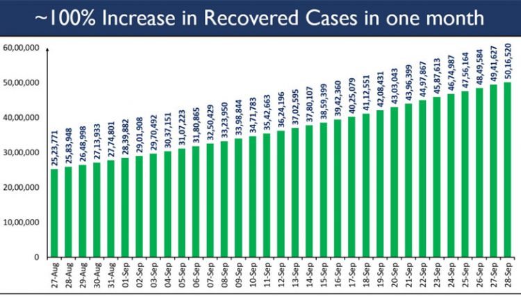 New Delhi(Kalinga Voice) : India has witnessed close to 100% increase in recoveries in the past month. More than 82% of total cases (exceeding 50L) recovered and discharged. Active cases (lower than 10L) a small proportion (less than 1/5th) of total cases.