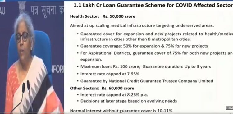 New Delhi (Kalinga Voice) : Finance Minister Nirmala Sitharaman announces Rs 1.1 lakh crore loan guarantee scheme for COVID19 affected sectors.Rs50,000 crores coverage for health sector, aimed at upscaling medical infrastructure targeting underserved areas. and Rs60,000 crores for other sectors.