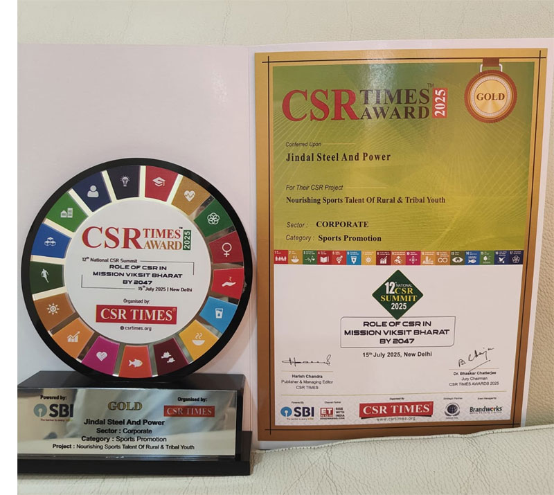 Bhubaneswar, July 16 2025 – The Jindal Foundation, the social arm of Jindal Steel, has been awarded the prestigious CSR TIMES Award in the Gold Category for Sports Promotion. H.E. Ms Jacqueline Mukangira, High Commissioner of the Republic of Rwanda to India, presented the award to Mr Prashant Hota, President & Group Head (CSR) of Jindal Steel, at the 12th CSR Summit in New Delhi. H.E. Mr Nguyen Thanh Hai, Hon’ble Ambassador – Embassy of the Republic of Vietnam to India; Dr Rashmi Singh, IAS, Secretary, Department of Women and Child Development; Maj Gen (Dr) Ramesh K Raina (RTD.), Director, Rashtriya Raksha University and Patron, Kakini Building Humanity; Prof. Bejon Mishra, Publisher and Editor, The Aware Consumer; and Air Marshal Shri V.P.S. Rana, PVCM, VSM (RTD.), Jury Member, CSR Times Awards 2025, were present in the programme.