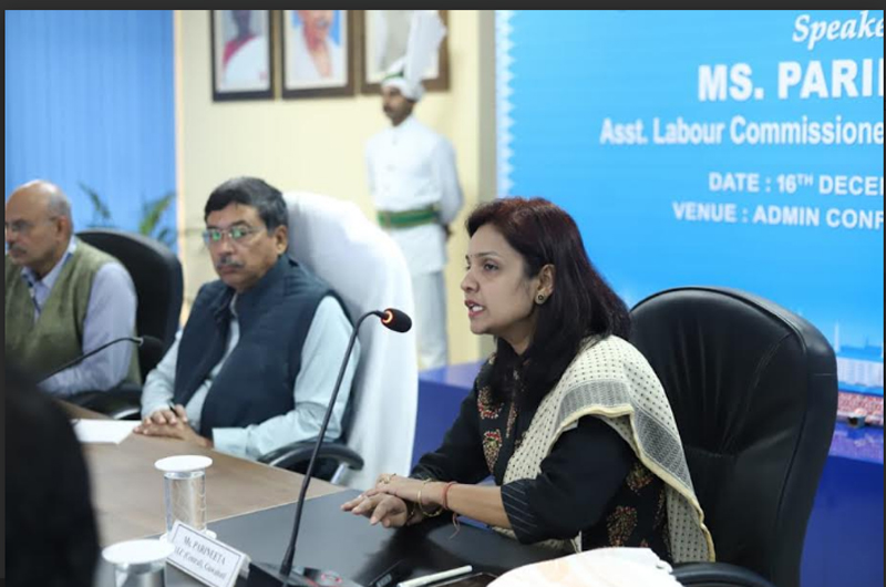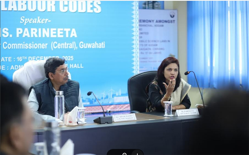 The session was addressed by Ms. Parineeta, Assistant Labour Commissioner, Guwahati, who served as the resource person for the programme. In her address, she elaborated on key provisions of the new labour codes, highlighting their implications for employers, contractors and workers. She emphasised the importance of fair labour practices, statutory compliance, safety, welfare measures and the shared responsibility of all stakeholders in ensuring a transparent and compliant work environment.