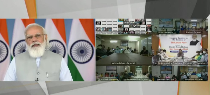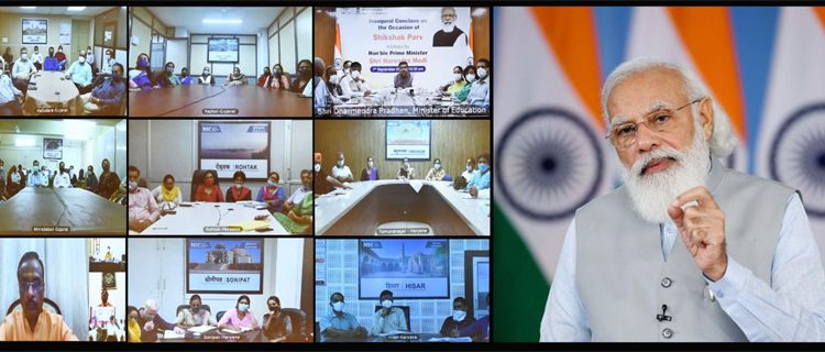 Prime Minister Shri Narendra Modi addressed the inaugural conclave of Shikshak Parv today via video conferencing. He also launched Indian Sign Language Dictionary (audio and text embedded sign language video for the hearing impaired, in conformity with Universal Design of Learning), Talking Books (audiobooks for the visually impaired), School Quality Assurance and Assessment Framework of CBSE, NISHTHA teachers’ training programme for NIPUN Bharat and Vidyanjali portal (for facilitating education volunteers/ donors/ CSR contributors for school development)