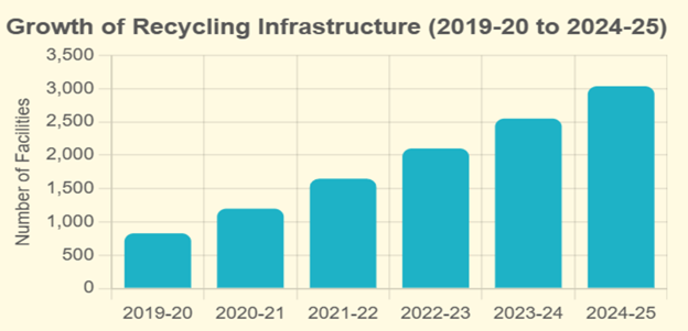 • Waste recycling infrastructure expanded significantly from 829 facilities in 2019–20 to 3,036 facilities in 2024–25, indicating a large-scale transition towards sustainable consumption and production.
