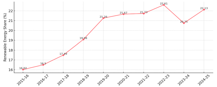 • India is the fourth-largest global wind energy producer. The share of renewable energy in total installed electricity generation capacity has increased from 16.02% in 2015–16 to 22.13% in 2024–25.