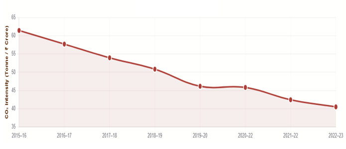 • Carbon intensity of the power sector declined from 61.45 tonnes CO₂ per ₹ crore in 2015–16 to 40.52 tonnes in 2022–23, reflecting a sustained transition towards low-carbon growth.