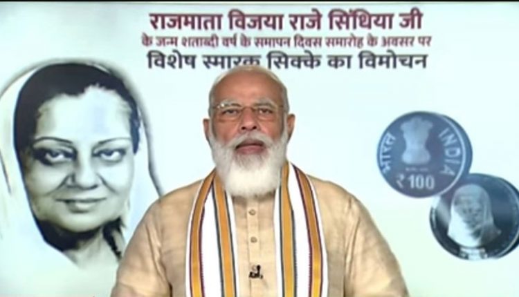 Prime Minister, Shri Narendra Modi released commemorative coin of Rs. 100 denomination to celebrate the Birth Centenary of Rajmata Vijaya Raje Scindia today through video conference. He also paid tributes to Rajmata on her birth anniversary.