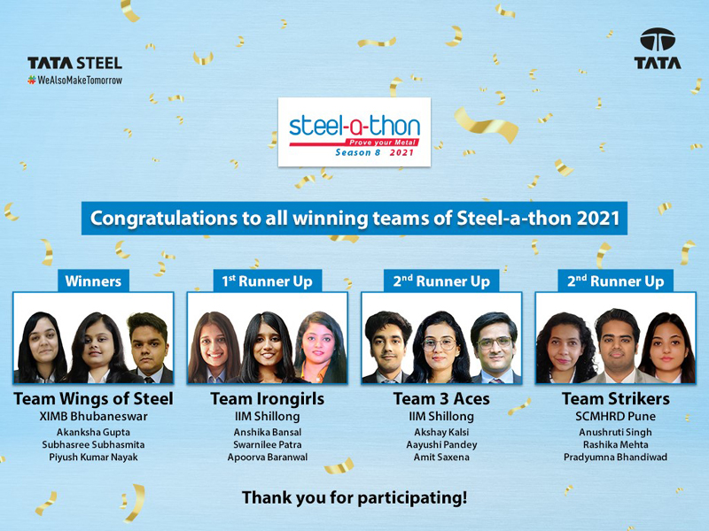 Mumbai,(KalingaVoice) : Tata Steel announces the Season 8 winners of its much-awaited Annual Business Challenge for premier B-Schools in India, ‘Steel-a-thon’. The programme culminated with the virtual Grand Finale held on Oct 7, 2021, where a total of 9 teams, the National Finalists, presented their business case solutions to a jury comprising senior management of Tata Steel led by Peeyush Gupta, Vice President, Supply Chain, Praveen Shrivastava, Chief of Marketing &Sales (Branded, Products & Retail), Flat Products, and Zubin Palia, Chief Group HR & IR.