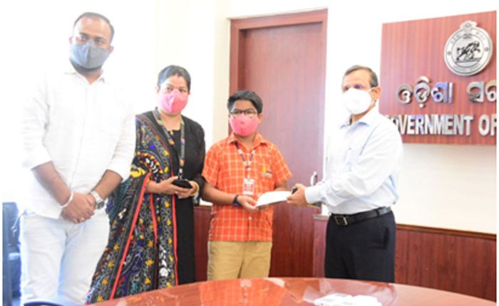Bhubaneswar(Kalinga Voice)- Prithvi Sarathi Routroy, a class-4 student of Sai International School donated Rs.10,351/- to CMRF through Chief Secretary Sri Suresh Chandra Mahapatra in State Lokseba Bhawan. Presenting the cheque, Prithvi said, ” Our Chief Minister Sri Naveen Patnaik is doing many things for children like me. He has done park and play ground for us. He is also making Special Covid hospital for children. I saved from my pocket money and also stopped Birthday feast to arrange this tiny contribution”. Mother of Prithvi Mrs Niharika and Father Mr Partha Sarathi Routroy were present at the moment.