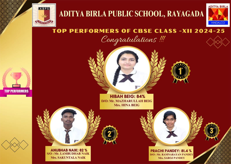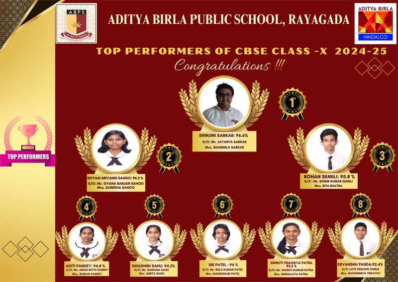 Aditya Birla Public School, Rayagada, is devotedly run by Utkal Alumina International Ltd. The administration is committed to maintain high standards supporting students in achieving their full potential. It extends heartfelt congratulations to the students, teachers, and parents on this remarkable achievement. The voice of the locality says that the outstanding performance in the CBSE Board Exams reflects the school’s dedication to nurture smart future leaders and responsible world citizens.