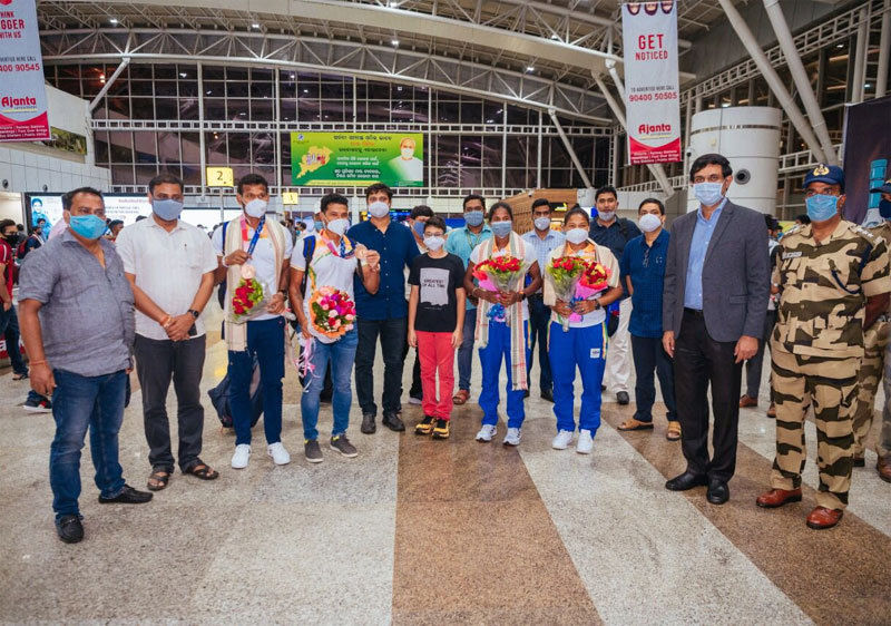 Bhubaneswar (Kalinga Voice): Following Indian National Hockey teams outstanding performance at the Tokyo Olympics, Hockey players from Odisha, Deep Grace Ekka, Namita Toppo, Birendra Lakra and Amit Rohidas returned home to rousing welcome and celebrations at Bhubaneswar airport and were received by Hon’ble Minister for Sports & Youth Services, Government of Odisha, Shri. Tusharkanti Behera, Commissioner-Cum- Secretary, Sports and Youth Services, Department, Government of Odisha, Shri. R. Vineel Krishna, Chairman Odisha Hockey Promotion Council, Shri Dilip Tirkey, Shri Abhijit Paul, Odisha Olympic Association, officials from the Sports and Youth Services Department, media and fans.
