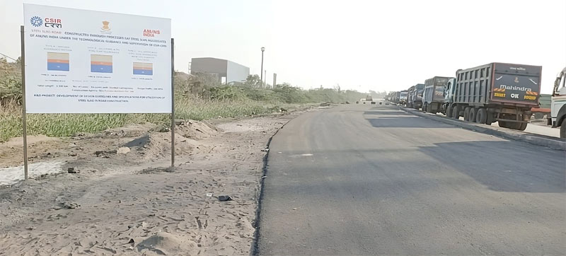 Utilisation of unprocessed steel slag in road making poses challenges in durability of roads and can cause environmental impact. To address this, CSIR-CRRI was awarded a national project by the Ministry of Steel, Government of India, to conduct scientific research on the uses of steel slag in road construction, with AM/NS India opting to collaborate for the initiative. As a result, India’s first ‘all steel slag road’ was built in Hazira using specially designed steel slag aggregates in collaboration with the CSIR – CRRI. The road, which was made by replacing natural aggregates in all the layers, was subsequently inaugurated by the then Hon’ble Union Steel Minister Ram Chandra Prasad Singh in 2022.