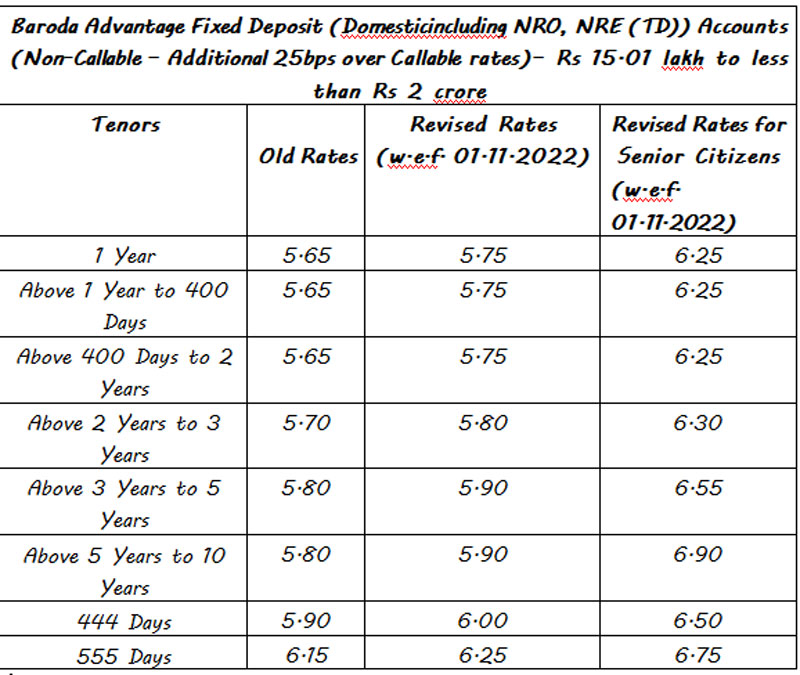 By increasing the Non-Callable Premium from 0.15% p.a. to 0.25% p.a., the interest rates on the Bank’s Baroda Advantage Retail Term Deposit Scheme (Non – Callable) have increased by 10 basis points.