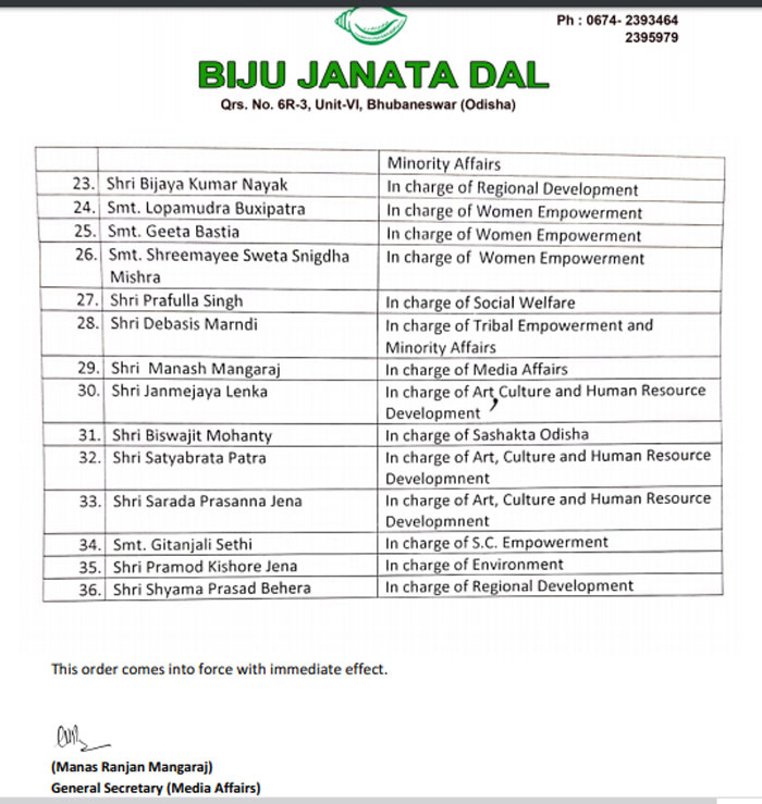 Bhubaneswar(Kalinga Voice) : BJD appointed 36 general secretaries. Today party released the list of general secretaries with special responsibilities. Four General Secretaries including Cabinet Minister are entrusted with “sashakta Odisha” ,3 for SC empowerment, 4 for tribal empowerment and minority affairs, one especially for minority affairs, 4 for Odisha: Mo Parivar, one each for student welfare and youth affairs and 4 general secretaries for women empowerment.Four General Secretaries are for art culture and human resource development, 3 for regional development, 2 for the environment, and four general secretaries fo social welfare and one general secretary for media affairs.