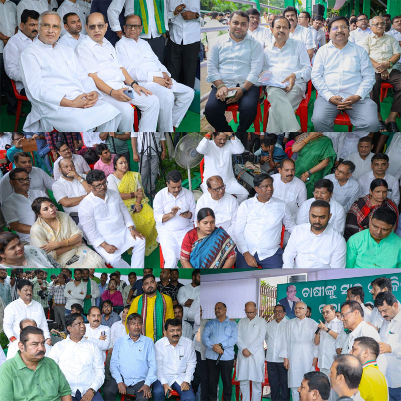 As per the pre-scheduled program, a massive protest was held today in front of Raj Bhavan. Thousands of farmers along with BJD leaders and workers participated. Senior party leaders alleged that farmers are facing immense difficulties in Kharif cultivation and the State Government has totally failed both in ensuring fertilizer supply and in preventing black marketing. Though the official price of a fertilizer bag is Rs 242, it is being sold in the open market at exorbitant rates ranging from Rs. 800 to Rs. 1000. In the past two decades, farmers of the state have never faced such an unprecedented crisis.