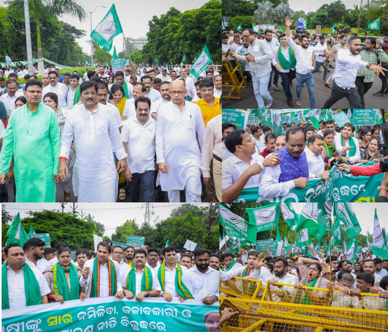 Bhubaneswar, 15/09/2025: The Biju Janata Dal (BJD) today staged a massive protest in front of the Raj Bhavan alleging that farmers across the state are distressed due to the shortage of fertilizers and attacked the State Government for its failure. At the peak of the Kharif season, the State Government has completely failed to supply fertilizers. The BJD alleged that since higher Kharif paddy production would compel the State Government to pay more bonus to farmers, the Government has deliberately created a shortage of fertilizers to restrict agricultural production.