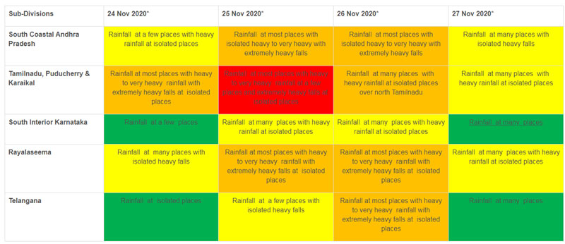 Isolated extremely heavy rainfall activity very likely over Tamilnadu & Puducherry (Pudukottai, Thanjavur, Tiruvarur, Karaikal, Nagapattinam, Cuddalore, Ariyalur & Perabalu districts during 24th and Kadalur, Kallakurchi, Puducherry, Villupuram, Tiruvannamalai, Chengalpattu to Ariyalur, Perambalur and Karaikal districts during 25th) and over south Coastal Andhra Pradesh & Rayalaseema (Nellore and Chittoor districts) on 25th & 26th and over Telangana on 26th November, 2020
