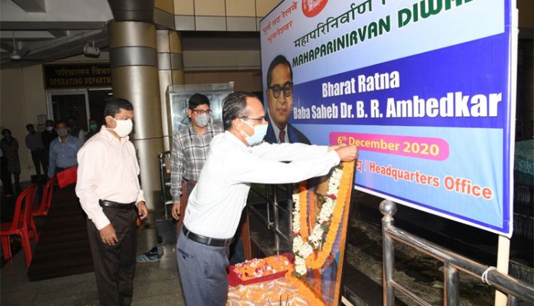 Bhubaneswar(Kalinga Voice): Bharat Ratna Babasaheb Dr. B. R. Ambedkar’s 65th Mahaparinirwan Diwas was observed at East Coast Railway headquarters, today. Senior Officers and staff of East Coast Railway headed by Additional General Manager, Shri Sudhir Kumar offered floral tributes o¬n the photograph of Babasaheb Dr. Ambedkar o¬n behalf of ECoR family. Shri Tushar Kanti Mandal, Principal Chief Personnel Officer of East Coast Railway co-ordinated the programme. Mahaparinirwan Diwas was also observed in all the Divisional Headquarters of East Coast Railway at Khurda Road, Waltair & Sambalpur by respective Divisional Railway Managers.