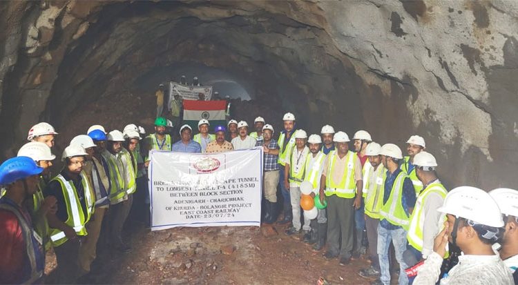 Bhubaneswar : The Khurda Road-Balangir Rail Link Project (301Kms) achieved a major milestone as Engineering Team of ECoR Construction wing conducted breakthrough for 700-meter-long escape tunnel from NH with the 4185-meter-long Tunnel in Adhenigarh-Charichhak Section under deep reserve forest of Madhapur Forest Range of Boudh District.