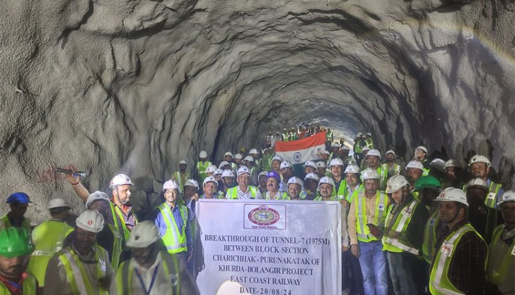 Bhubaneswar: In a significant achievement in Khurda Road-Balangir Rail Line Project, the East Coast Railway (ECoR) has successfully completed the breakthrough of a 1,975-meter-long tunnel (Tunnel No. 07) between Purunakatak and Charichhak. This marks a critical step forward in the ongoing efforts to expand and improve rail connectivity in the region.
