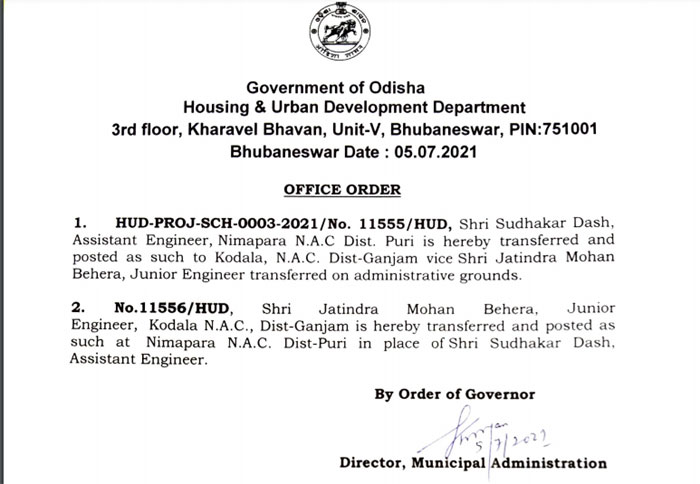 Similarly, Sri Sudhakar Dash Asst Engineer Nimapada NAC has been transferred on administrative grounds. In this connection Orders heve been issued by Housing and Urban Development Department today. It may be mentioned here that the department has taken a very serious view towards any kind of irregularities in the implementation of developmental works in Urban Local bodies..