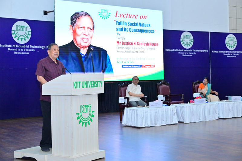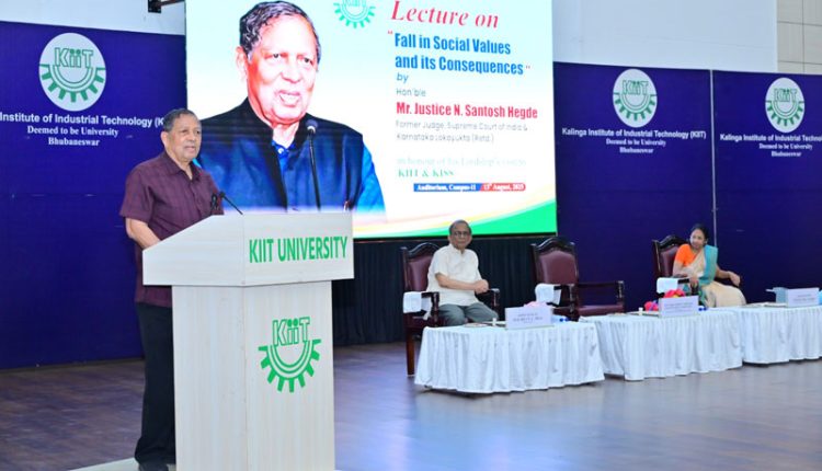 Bhubaneswar, Aug 13: Greed is a disease for which there is no medicine, and it is at the root of the fall in our social values, said former judge of Supreme Court and retired Karnataka Lokayukta Justice N Santosh Hegde. In a powerful and candid address at KIIT Law School on “Fall in Social Values and Its Consequences”, Justice Hegde lamented how the relentless pursuit of money and power has eroded moral integrity and weakened society’s foundations.