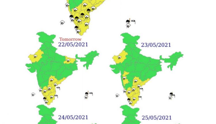 21 May (Day 1): ♦ Thunderstorm with lightning & gusty wind (speed reaching 40-50 kmph) very likely at isolated places over Andaman & Nicobar Islands; with lightning & gusty wind (speed reaching 30-40 kmph) at isolated places over Haryana, Chandigarh & Delhi, Bihar, Jharkhand, Gangetic West Bengal, Odisha, Assam & Meghalaya, Telangana, Rayalaseema and Kerala & Mahe and with lightning at isolated places over Uttarakhand, Punjab, Vidarbha, Chhattisgarh, Sub-Himalayan West Bengal & Sikkim, Arunachal Pradesh, Nagaland, Manipur, Mizoram & Tripura, Konkan & Goa, Coastal Andhra Pradesh & Yanam, Karnataka, Tamil Nadu, Puducherry & Karaikal and Lakshadweep.