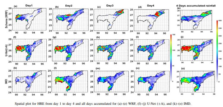 Between June 13 and 17, 2023, Assam experienced severe flooding due to heavy rainfall. The DL model was able to more accurately predict the spatial distribution and intensity of rainfall across at districts scale. The research employed the WRF model to generate initial weather forecasts in real time, which were then refined using the DL model. This method allowed for a more detailed analysis of rainfall patterns, incorporating a spatio-attention module to better capture the intricate spatial dependencies in the data. As discussed, the model was trained using data from past heavy rainfall events from multiple ensembles outputs as well as observations from India Meteorological Department (IMD), to improve its accuracy.