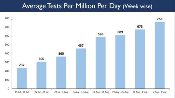 The average daily tests conducted (week wise) are demonstrating a consistent increase. This has registered a 3.2 times expansion from third week of July (3,26,971) to first week of September (10,46,470).