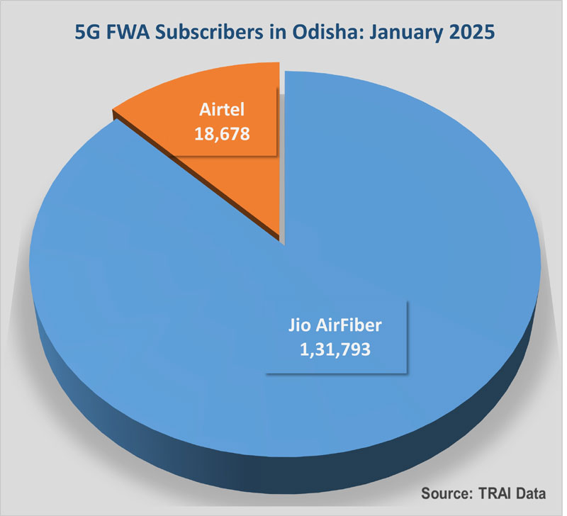 Bhubaneswar: Reliance Jio has solidified its dominance in the 5G FWA segment in Odisha with Jio AirFiber commanding over 87% 5G FWA subscriber market share in the state. This has been revealed by the latest telecom subscription data released by Telecom Regulatory Authority of India (TRAI), this week. For the first time TRAI has released the subscription numbers for 5G FWA segment, separately. As per the data released by TRAI, Reliance Jio’s 5G FWA service Jio AirFiber is leading by a huge margin, with over 1.3 lakh Jio AirFiber subscribers in the state, followed by Airtel, a distant second, with around 18000 subscribers as on January 31, 2025. The total 5G FWA subscriber base in Odisha has surpassed 1.5 lakhs in January 2025, as per the data released by TRAI.