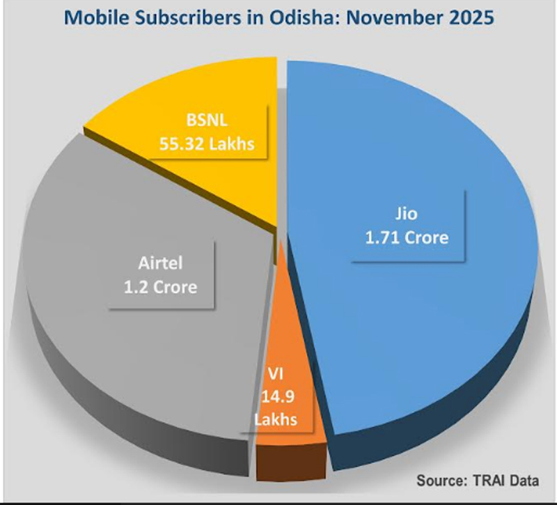 Bhubaneswar: Continuing its excellent march as the No. 1 digital service provider in Odisha, Reliance Jio added the highest around 1.85 lakh new subscribers in the wireless, wireline and fixed wireless access (FWA) segments in the month of November 2025. As per the latest telecom subscription data released by Telecom Regulatory Authority of India (TRAI), Reliance Jio added the highest over 1.59 lakh new mobile subscribers and over 25000 new home broadband subscribers in Odisha in November. While Jio added over 1.59 lakh new mobile subscribers in Odisha in November, its nearest competitor Airtel lost over 10000 mobile subscribers. Both Vodafone Idea and BSNL added just 3027 and 2433 new mobile subscribers, respectively, in the same period. With this robust performance, Jio further consolidated its market leadership in Odisha with around 1.71 crore mobile subscribers and over 47.3 percent mobile subscriber market share, as of November 30, 2025. This milestone has been powered by the unmatched consumer trust in Jio’s services and the technological superiority of its all-IP 4G and True 5G networks across the state. The ultra-affordable JioBharat 4G phone, also enabled thousands of 2G customers to upgrade to 4G, particularly in rural and remote regions across Odisha.