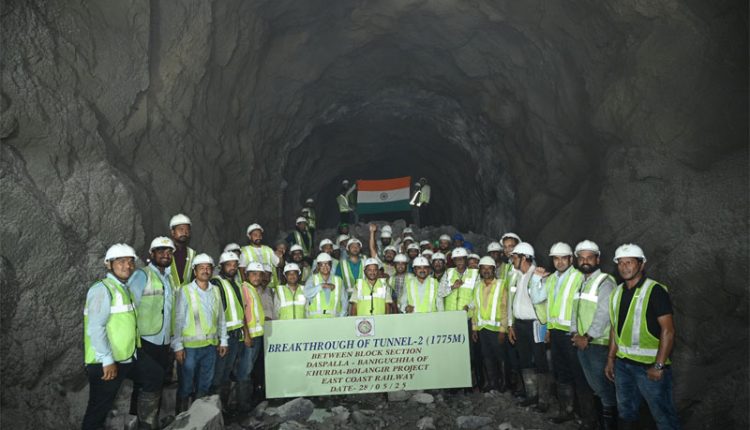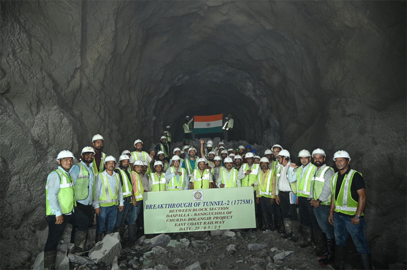 Bhubaneswar, 1st June 2025: The Khurda Road – Balangir New Rail Line Project has achieved a historic milestone with the successful breakthrough of Tunnel No. T2, located between Buguda and Daspalla in Nayagarh District. The final breakthrough was completed on 30th May 2025, marking the completion of excavation work across all seven planned tunnels in this strategic railway corridor.