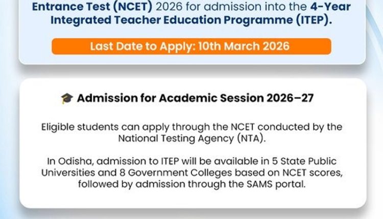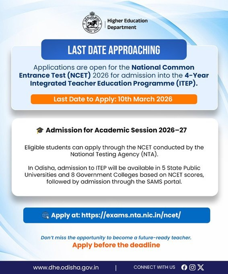 According to the Higher Education Department, admissions to the four-year B.Ed course under the Integrated Teacher Education Programme (ITEP) will be conducted through the NCET examination from the 2026–27 academic session. The NCET-2026 examination is scheduled to be held on 17th April, 2026.
