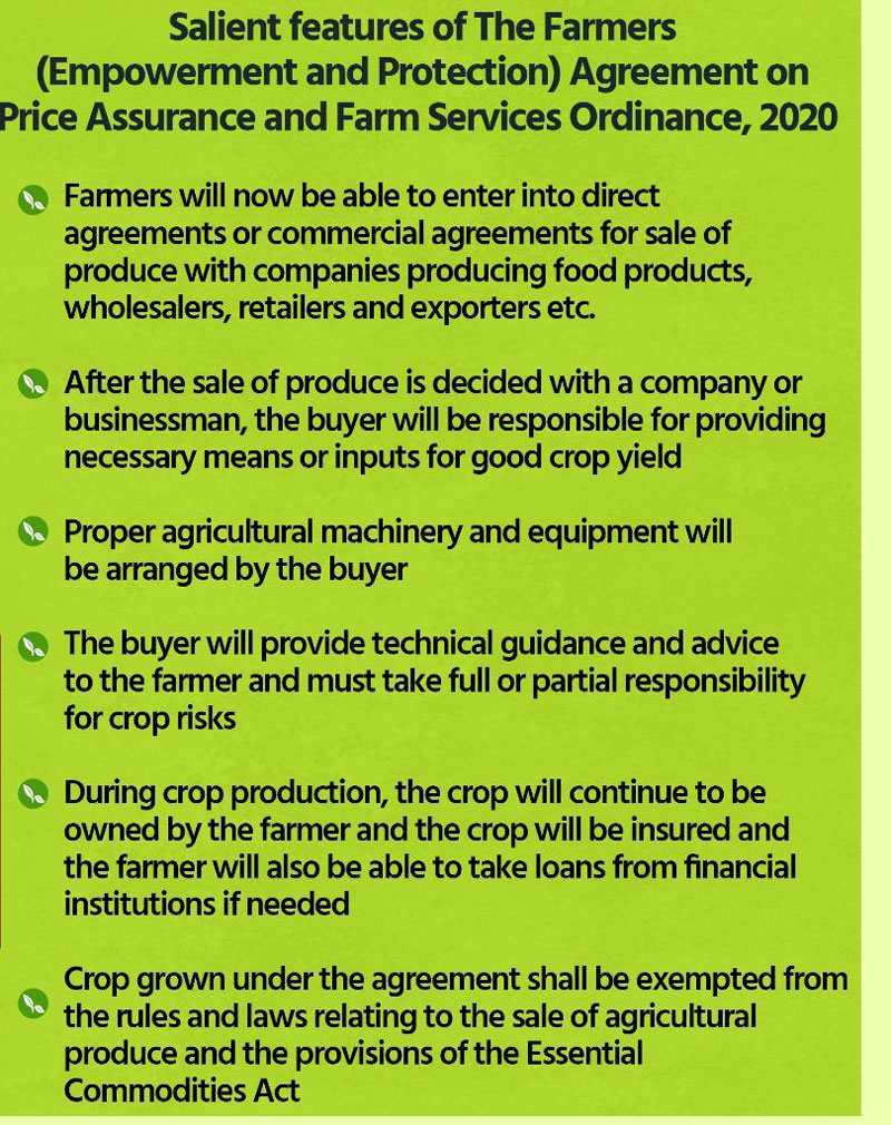 Farmers will engage in direct marketing thereby eliminating intermediaries resulting in full realization of price. Farmers have been provided adequate protection. Sale, lease or mortgage of farmers’ land is totally prohibited and farmers’ land is also protected against any recovery. Effective dispute resolution mechanism has been provided for with clear time lines for redressal.