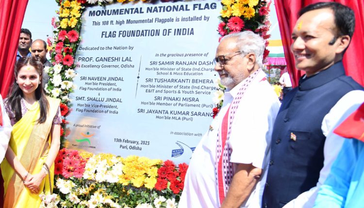 Puri(Kalinga Voice) : Hon’ble Governor of Odisha Prof. Ganeshi Lal hoisted a Mammoth 36 ft x 24 ft Tiranga on a 108 ft high monumental flagpole installed by Flag Foundation of India (FFoI) at Batagaon Chhak, Puri town. FFoI’s President Shri Naveen Jindal, Vice President Smt. Shallu Jindal, Hon’ble Minister of State (Ind charge) School and Mass Education Shri Samir Ranjan Dash, Hon’ble Minister of State (Ind charge) E&IT and Sports and Youth Services Shri Tushar Kanti Behera, Hon’ble MLA Shri Jayant Kumar Sarangi and senior official of the District were present on the occasion.
