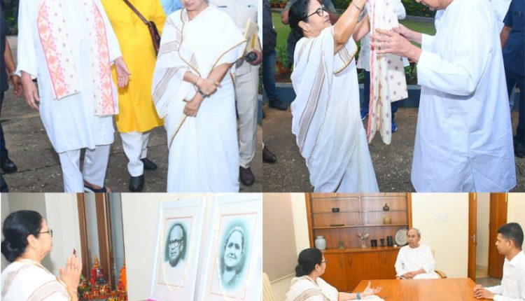 Bhubaneswar (Kalinga Voice) : West Bengal Chief Minister Ms Mamata Benarjee met Chief minister Naveen patnaik at Naveen Nivas . CM Sri patnaik welcomed Ms Banerjee with presenting Sri Anga vastra of Mahaprabhu . Also presented Replica of three charoits . Chief Minister also presented to wB cm a filigree work and Chhenapoda .