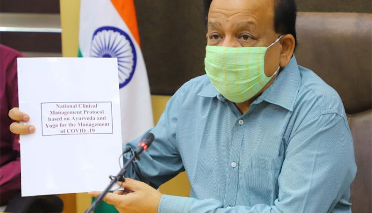 Dr. Harsh Vardhan, Union Minister for Health & Family Welfare today released National Clinical Management Protocol(NCMP) based on Ayurveda and Yoga for management of COVID-19 in the virtual presence of Sh. Shripad Yesso Naik, Minister of State for AYUSH (Independent Charge). Dr. Rajiv Kumar, Vice Chairman, NITI Aayog and Dr. V. K. Paul, Member (Health), NITI Aayog also joined virtually.