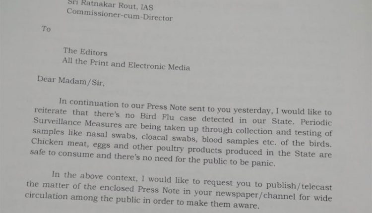 Bhubaneswar(Kalinga Voice) : There is no Avian Influenza (Bird Flu) detected in Odisha, says Director cum Commissioner AH&VS Sri Ratnakar Rout in a press release today .