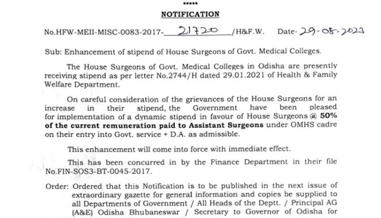 Bhubaneswar : On careful consideration of the Grievances of the House Surgeons for an increase in their stipend , the Government have been pleased for implementation of a Dynamic stipend in favour of House Surgeons @ 50 % of the current remuneration paid to Assistant Surgeons under OMHS cadre on their entry into Government Service + DA as admissible says the notification from H&FW Department