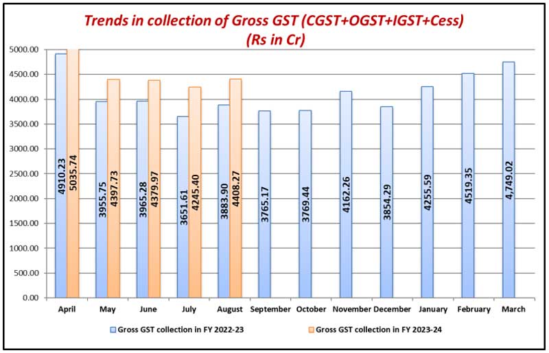 With regard to Gross GST collection (OGST+IGST+SGST+Cess), the State has recorded a collection of Rs. 4408.27 Cr during August ‘23 against collection of Rs. 3883.90 Cr over corresponding period of August ‘22 with a growth rate of 13.50%.