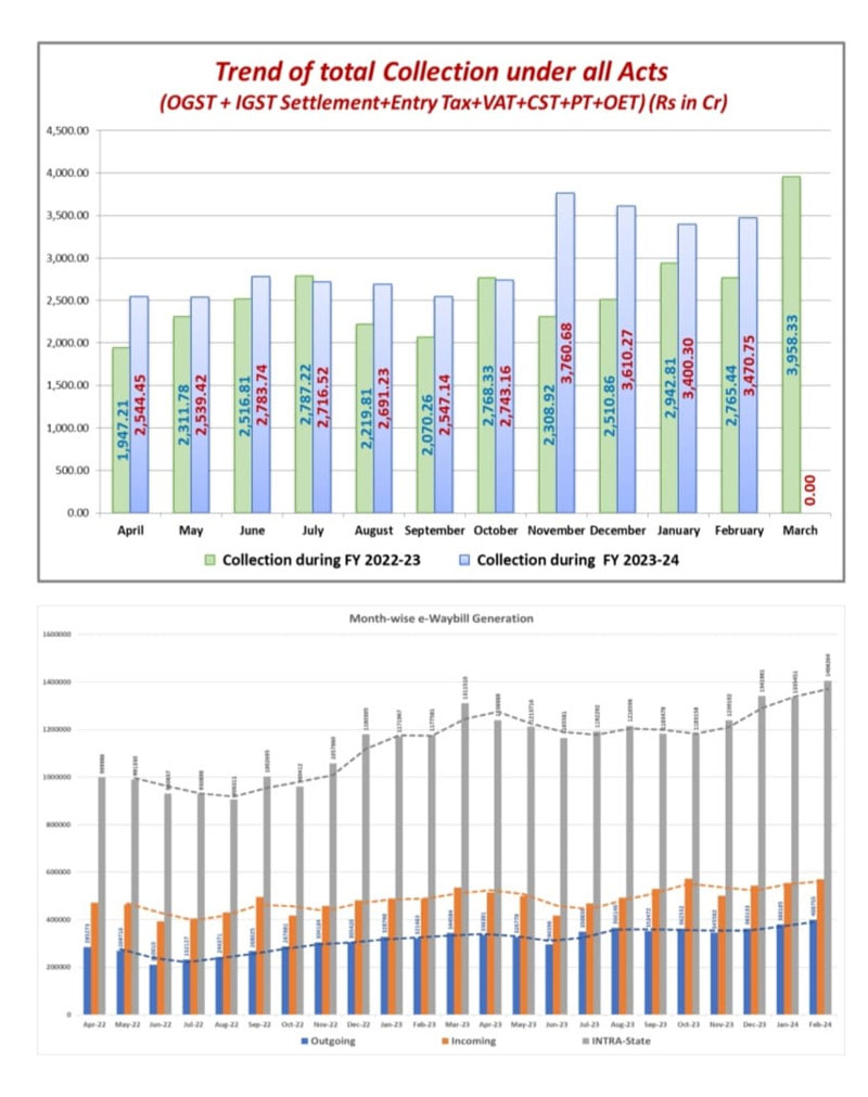 During February 24, 23.77 Lakh of waybills have been generated vis-à-vis 19.86 Lakh of waybills generated during February 2023 recording a growth of 19.69% reflecting the buoyancy in the State economy. Out of the 23.77 Lakh e-waybills generated during February 24, 14.06 Lakh were intra-state waybills while 9.71 Lakh were inter-state waybills.