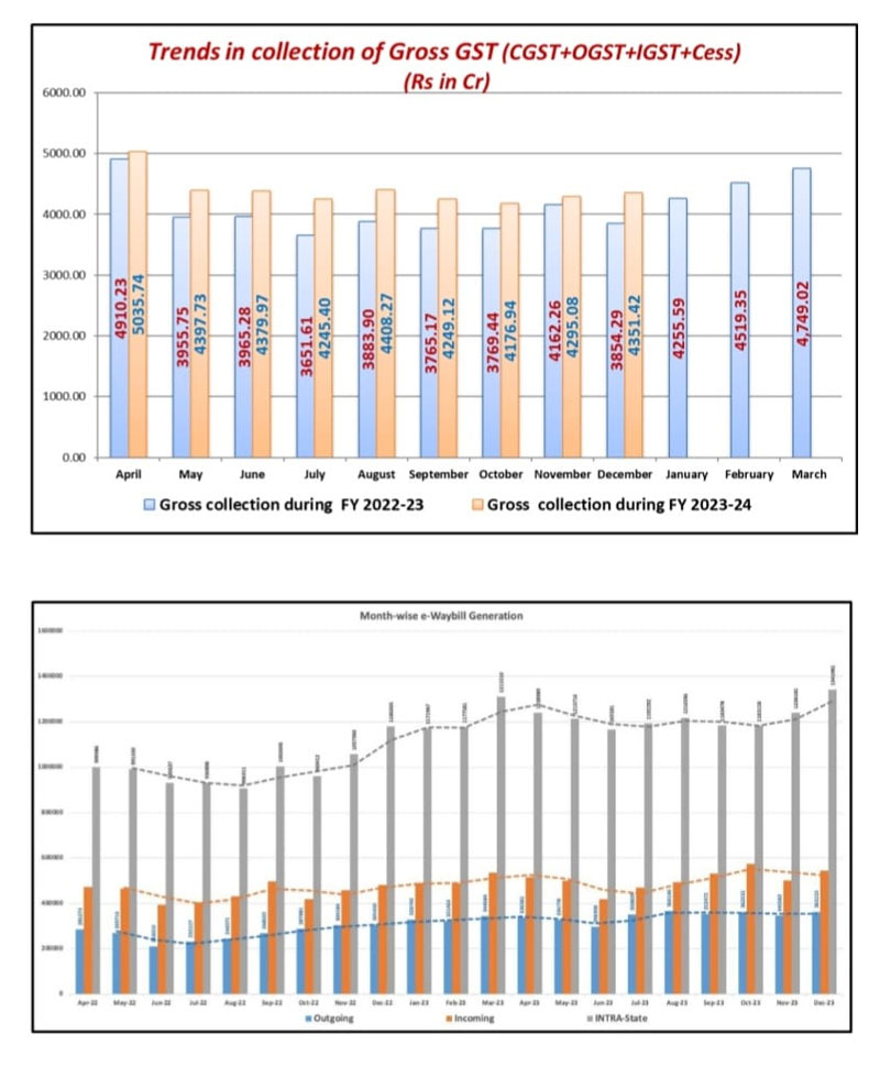 With regard to Gross GST collection (CGST+ IGST+ SGST+ Cess), the State has recorded a collection of Rs. 4351.42 Cr during December ’23 against collection of Rs. 3854.29 Cr during December ’22 with a growth rate of 12.90%. The progressive Gross GST collection during FY 2023-24 (till December 23) is Rs. 39539.67 Cr with growth of 10.08% over corresponding period of FY 2022-23.