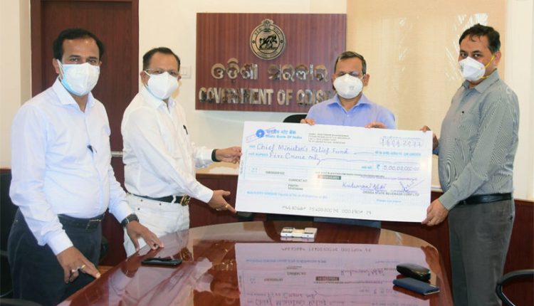 Bhubaneswar, (Kalinga Voice)-The Odisha State Beverages Corporation Ltd., a Public Sector undertaking has donated Rs. 5.00 Crore to Chief Minister’s Relief Fund as its contribution to State’s fight against the Covid pandemic.