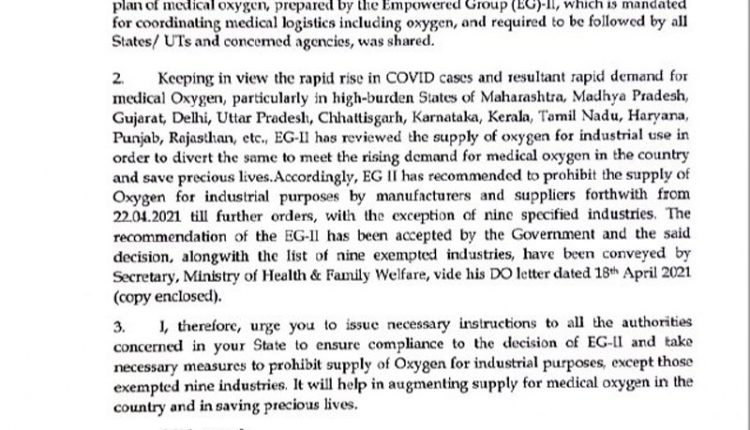 The letter of the Union Home Secretary follows the decision taken by the Central Government today, on the recommendations of the Empowered Group-II, that the supply of oxygen for industrial purposes by manufacturers and suppliers is prohibited (except in nine industries) forthwith from 22.04.2021 till further orders, so as to augment supply for medical oxygen in the country and to save precious lives.
