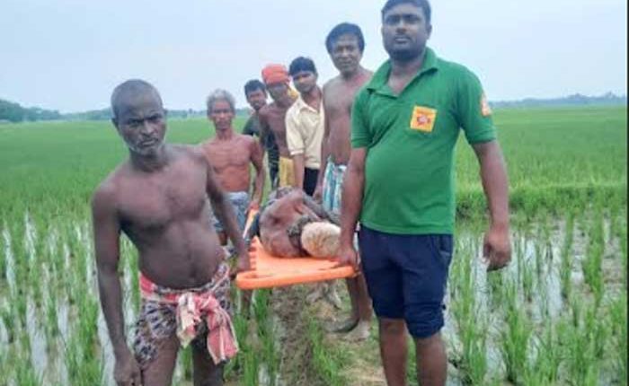 Puri: A 108 ambulance was informed about an unidentified patient from Sauria village in Delang block of Puri district on 16th Sep. The man reportedly fell ill while working on the foeld. On receiving the information, 108 ambulance pilot, Sujit Kumar Das, EMT Amiya Maharishi and assistant Mutyunjay Jena immediately took a 108 ambulance from the Jatni community health centre and left for the patient’s village.  But on the way to reach the patient, the condition of the road at Barabati Chowk was very bad, due to which the ambulance could not proceed further and stopped halfway. Then the ambulance crew walked to the patient’s village and with the help of locals, carried the patient on a stretcher for 5 km to the ambulance. After which the patient was brought by ambulance from there and admitted to Khurda district hospital. The ambulance crews have been highly praised for such humanity .