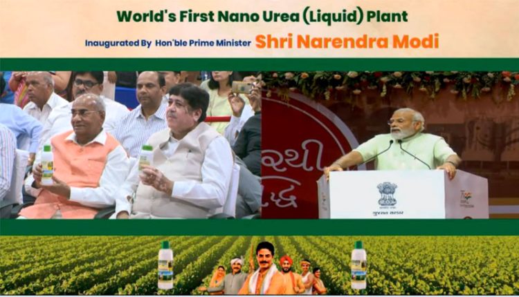 Kalol: Prime Minister Shri Narendra Modi today inaugurated the World’s first Nano Urea Liquid plant by IFFCO at Kalol, Gujaratin an effort to provide farmers the means to boost productivity & help increase their income. A Giant Step towardsAtmanirbharBharat &AtmanirbharKrishi.PM dedicated the Ultramodern Nano Urea Liquid Fertilizer plantto the service of the Nation at a ceremony held at Gandhinagar Gujarat. Shri Amit Shah, Union Home Minister and Minister of Cooperation,Chief Minister of Gujarat Shri Bhupendra Patel and Union Minister of Health and Family Welfare,Chemicals and Fertilizers Dr. Mansukh Mandaviyawere present at the ceremony.