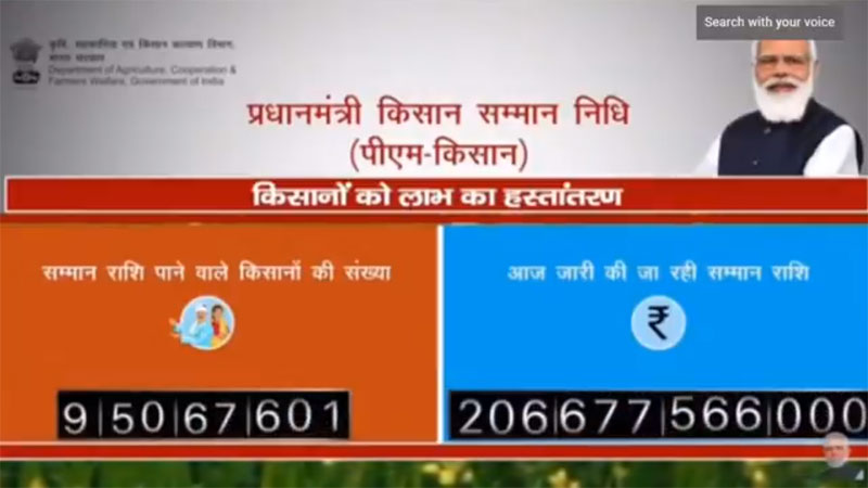 Prime Minister Shri Narendra Modi released 8th instalment of financial benefit of Rs 2,06,67,75,66,000 to 9,50,67,601 beneficiary farmers under Pradhan Mantri Kisan Samman Nidhi (PM-KISAN) scheme today via video conferencing. Prime Minister also interacted with farmer beneficiaries during the event. Union Agriculture Minister was also present on the occasion.