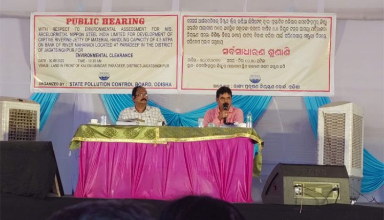 Paradeep(Kalinga Voice) : The Public Hearing for the proposed 4.5 MTPAcaptive riverine jetty of ArcelorMittal Nippon Steel India (AM/NS India)at the bank of River Mahanadi located in Udayabata village of Paradeep in Jagatsinghpur District has been conducted by Regional Office of Odisha State Pollution Control Board (OSPCB). Dr.Kanhu Charan Dhir, ADM, Paradeep presided over the meeting. Mr Puskar Chandra Behera, Regional Officer, OSPCB conducted the public hearing meeting in presence of Mr Nimain Charan Sethy, Additional SP, Paradeep, Ms Sabyasachi Rout, IIC, Paradeep Lock Police Station, Ms Bibechita Sarangi, Dy Environment Engineer, OSPCB, Paradeep and Ms Twinkle Mohanty, Dy Environment Engineer, OSPCB, Paradeep.