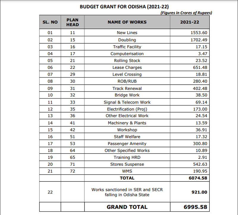 A quantum jump has been given to passenger amenities from 129 Cr to 429 cr. To eliminate level crossings of LC Gates Rs 400 Cr has been sanctioned as against 324 Cr last year. Total budget outlay for development of infrastructure and safety-related works for Odisha is Rs 5528 Cr for 2021-22, which does not include many other projects and estimates as they are not significant enough for mention at the ministry level; but for ECoR and Odisha, these are important development works. The funding for Odisha in 2021-22 under all plan heads combined is Rs 6995.58 Cr.
