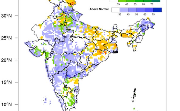The spatial distribution of probabilistic forecasts for tercile categories (above normal, normal and below normal) for the seasonal rainfall (June to September) is shown in Fig.1.The spatial distribution suggests either normal or above normal probability is likely over most parts of the country.